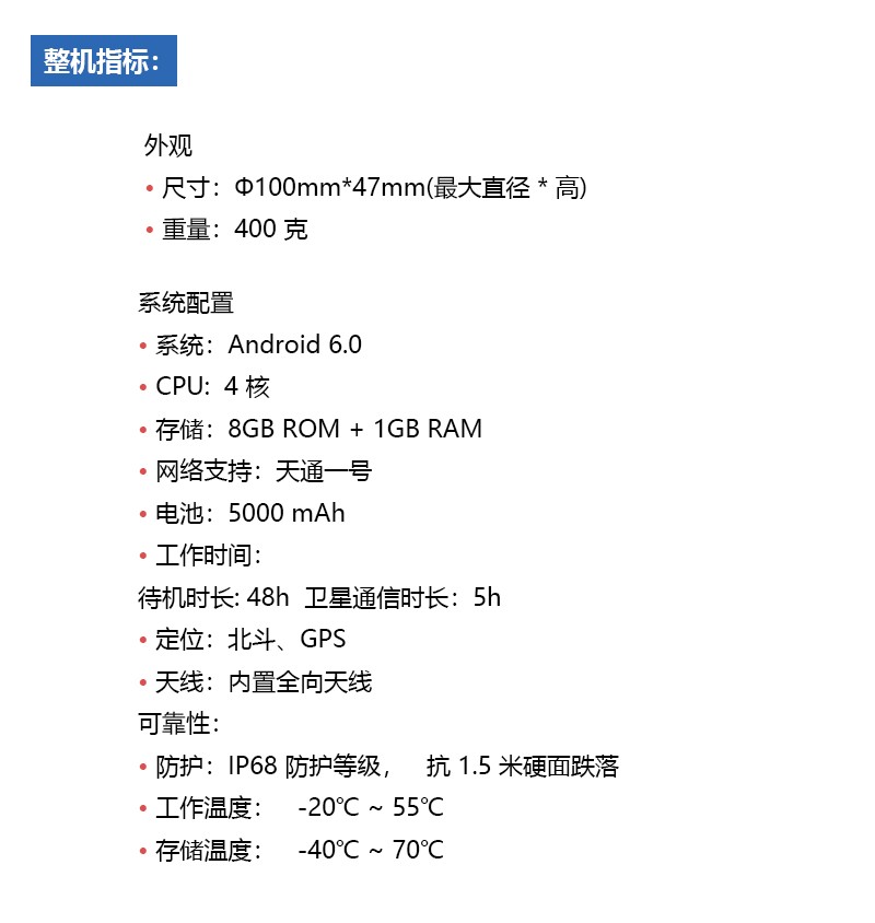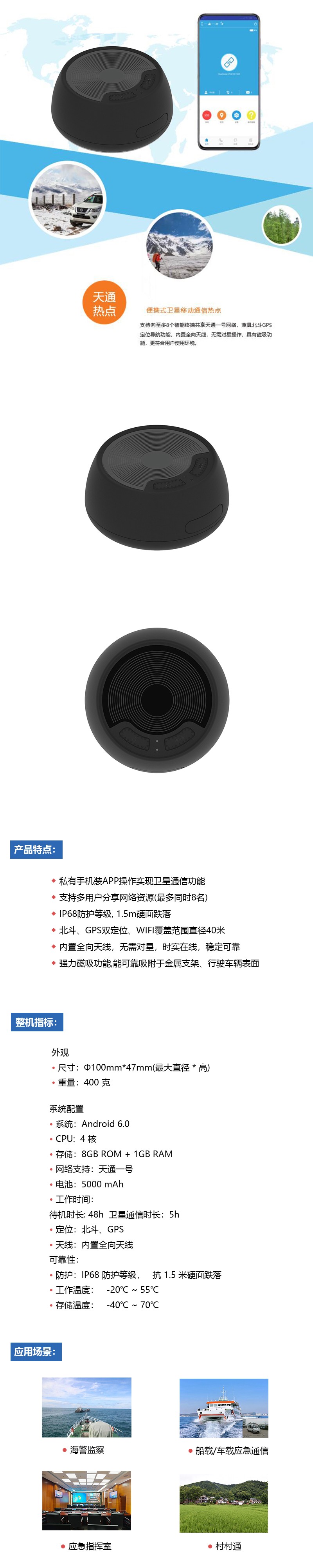 天通宽带便携终端是支持天通一号网络384kbps数据传输的天通卫星宽带终端,普通智能手机便携式WiFi热点连接,同时支持稳定的文本消息、图片、语音、视频多媒体网络传输业务。天通宽带便携终端具备北斗GPS导航定位功能,支持紧急呼叫和SOS一键呼救;无需对星操作,内置全向天线,可应用于野外监测,户外旅行,风力电站,海洋科考,海洋钻井平台等场景应用。